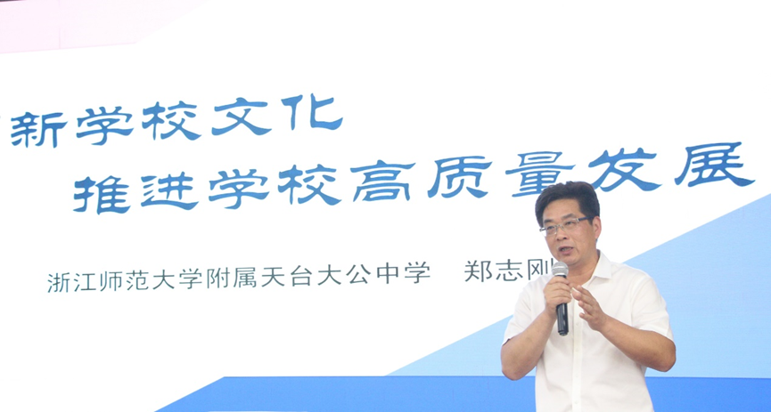 郑志刚校长介绍了浙师大附属天台大公中学的历史沿革及其“大爱育才,至正为公”的教育宗旨,并阐述了学校文化在学校管理和发展中的重要性。他认为,每所学校都承载着独特的文化基因,这些基因源于深厚的历史底蕴,立足于现实需求,同时展望未来发展。通过精心雕琢学校的环境文化、制度文化、行为文化以及精神文化,可以构建出独具特色的学校文化体系。这种体系不仅展现了学校的独特魅力,更成为推动学校高质量发展的强大动力。他指出,要坚持以优秀的文化引领学校的发展,充分发挥文化在学校建设中的核心作用,将学校文化融入教科研体系、课程体系以及课堂教学的每个环节,让学校文化不断引领学校向着更高、更远的目标迈进。