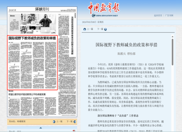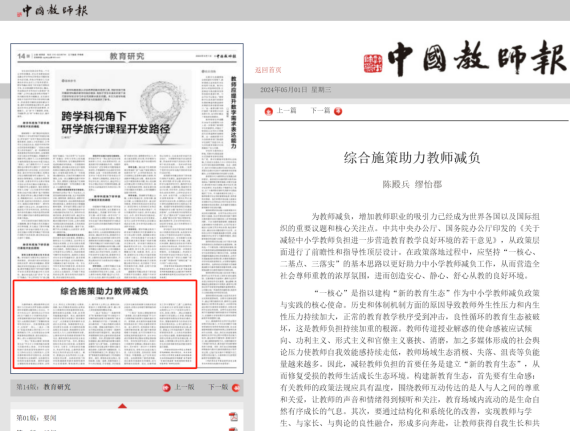 近日,中央教育工作领导小组印发通知,再次部署中小学教师减负工作。9001jcc金沙以诚为本陈殿兵副教授、硕士生缪怡郡在《中国教育报》《中国教师报》刊发教师减负系列署名文章助力教师减负的政策与实践努力,让教师能安心、精心、舒心地从教,促进其专业可持续发展和教育高质量发展。