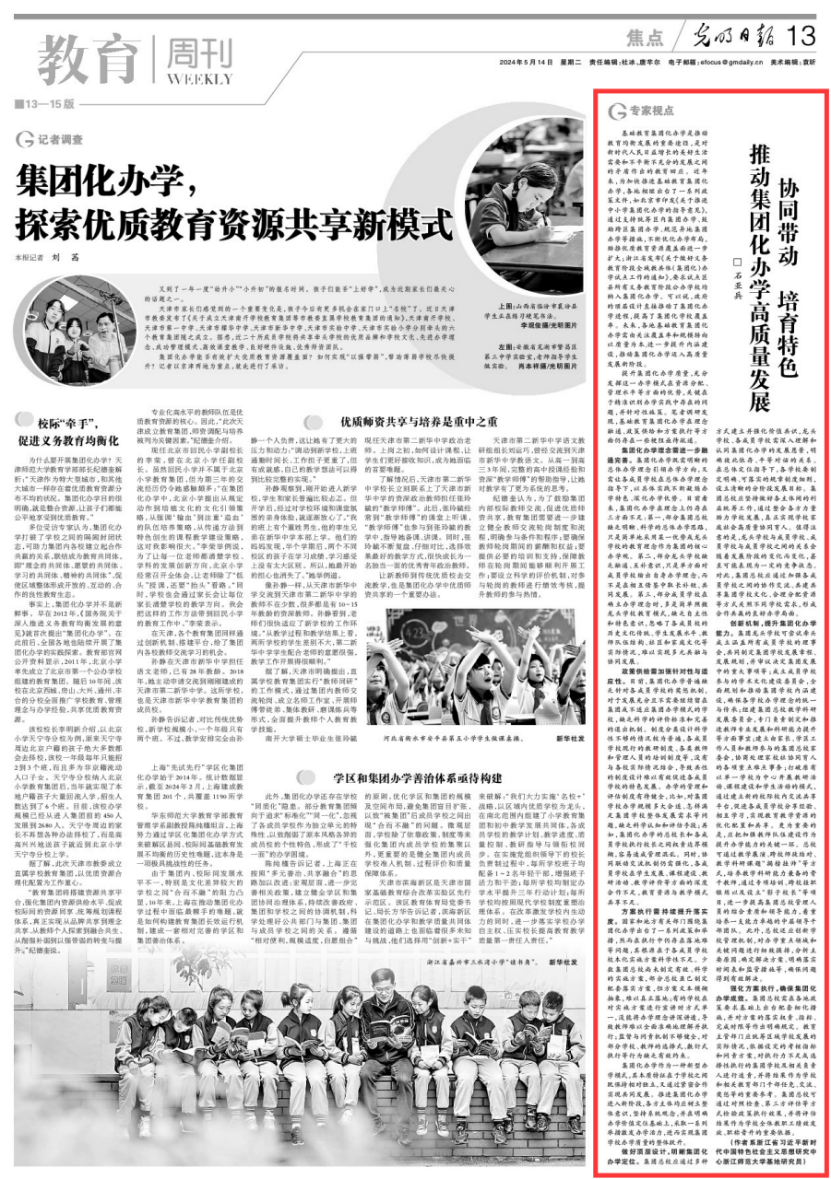 日前,9001jcc金沙以诚为本石亚兵老师在《光明日报》发表署名文章《协同带动 培育特色 推动集团化办学高质量发展》。文章提出了基础教育集团化办学已经迈入了“质量优先”新阶段的观点,为新时代义务教育优质均衡发展提供了新的思考。