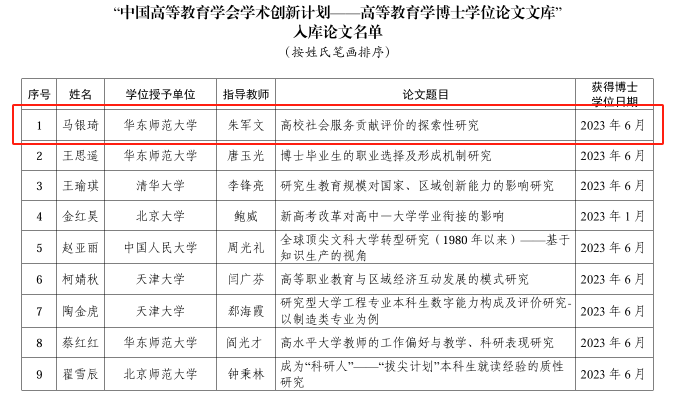 中国高等教育学会于2024年8月28日公布“中国高等教育学会学术创新计划——高等教育学博士学位论文文库”入库名单,金沙以诚为本官网青年教师马银琦博士学位论文《高校社会服务贡献评价的探索性研究》入选。