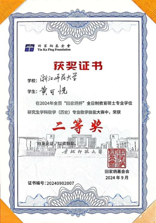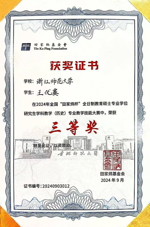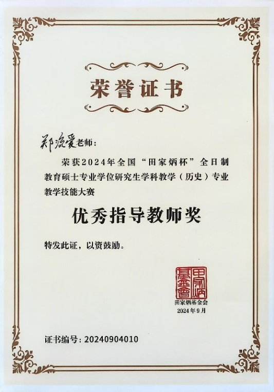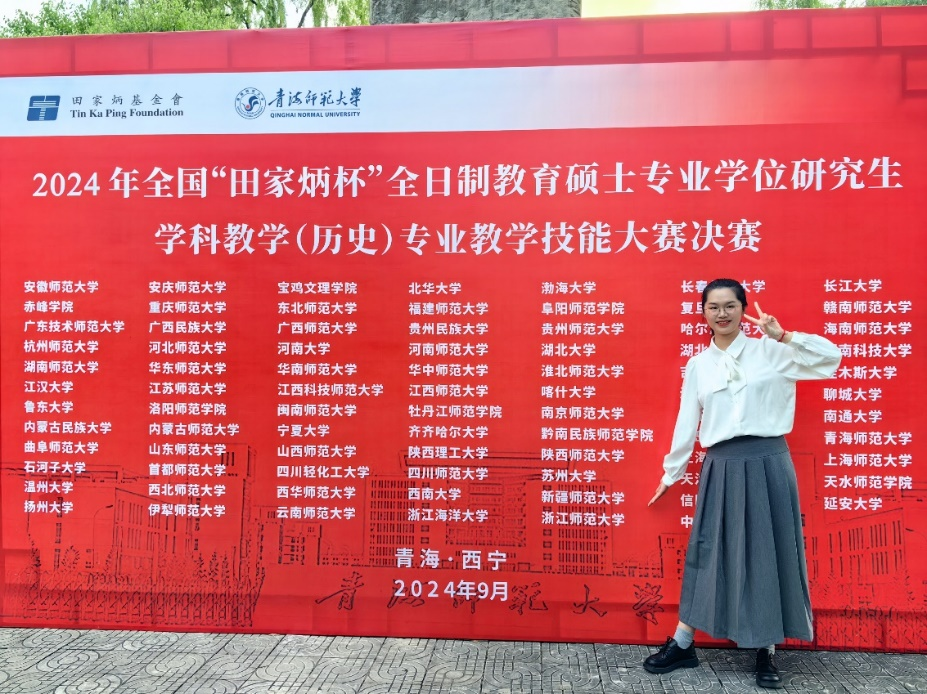 近日,2024年全国“田家炳杯”全日制教育硕士专业学位研究生学科教学(历史)专业教学技能大赛决赛在青海师范大学举办。经过激烈角逐,教育学子黄可悦获得二等奖,王优赛获得三等奖。郑流爱教授获得优秀指导教师奖。
