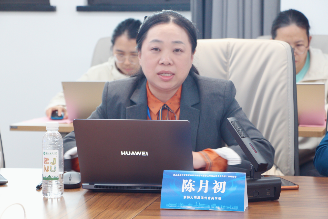 浙师大附属温州育英学校书记、校长陈月初强调了与浙师大合作的重要性,表达了希望加强在教师培训、科研能力提升、特色数字教育和国际交流等方面的沟通与合作。期望通过浙师大的资源和专家指导,提升学校的办学水平和科研能力,同时开拓学生的国际视野。