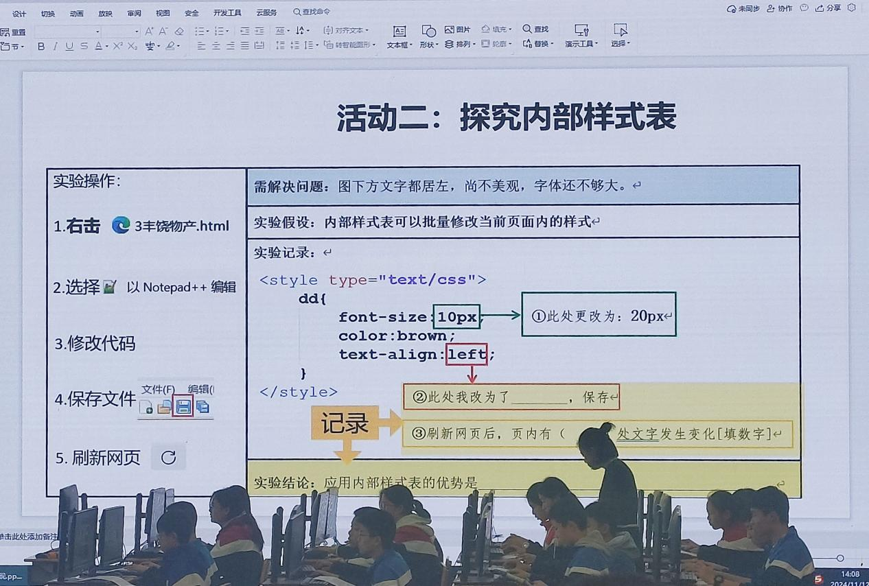 周旺琼老师的课堂,则如同一幅精美的画卷,引领学生们走进了网页设计的大门。周老师以一幅家乡美景图片为引子,巧妙地将学生们的思绪引向了网页设计的奇妙世界。通过“认识内联样式表”、“探究内部样式表”、“调用外部样式表”三个课堂探究活动,学生们不仅掌握了CSS样式表的三种方式,还在一次次网站美化修改中锻炼了批判思维与逻辑思考能力,感受到了美学与逻辑的完美融合。
