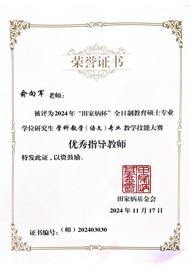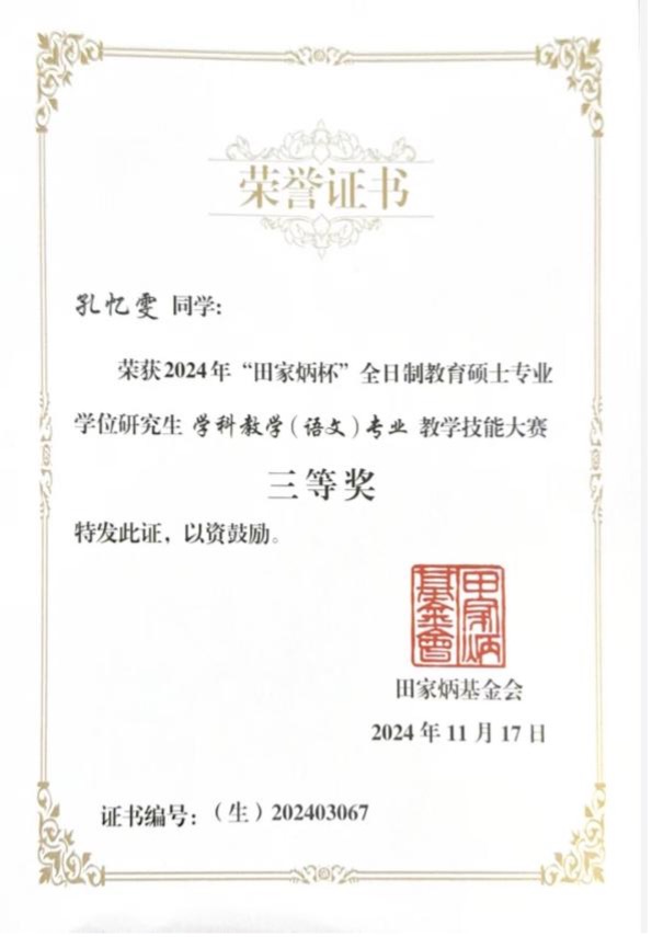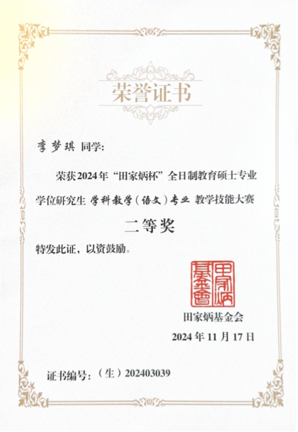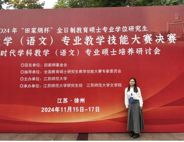 11月15-17日,2024年全国“田家炳杯”全日制教育硕士专业学位研究生学科教学(语文)专业教学技能大赛决赛在江苏师范大学举办,金沙以诚为本官网两名学生入围决赛,任睿老师带队参与,通过激烈的竞争,李梦琪获得二等奖,孔忆雯获得三等奖,俞向军老师获得优秀指导教师奖。