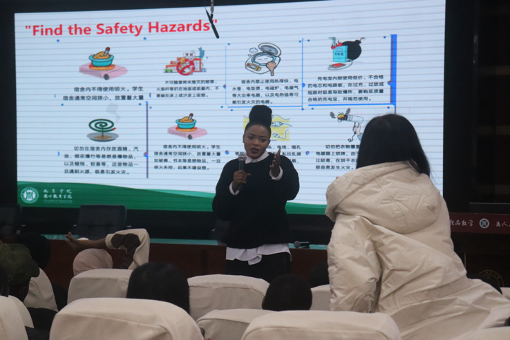 安全护航环节,刘颖以发生在我们身边的留学生交通问题案例引入,希望大家引起对安全问题的高度重视。随后,在中国生活学习6年的尼日利亚籍留学生代表IBEAKAMMA CHINAZAEKPERE UGOCHINYERE,从财产安全、交通安全、居住安全和网络安全四个方面,结合自身经历详尽地介绍了各类安全知识,指出作为留学生在关注自身安全问题的同时一定要有规则意识,做自己的安全第一责任人。
