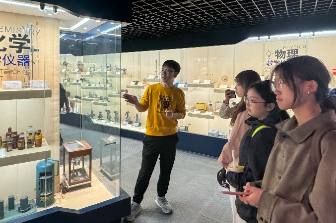 在发展史展区,从一开始尚未普及的幻灯机到“两机一幕”推广后慢慢常见的投影仪,从纸笔构成的课堂到教学专用平板;在教学仪器展区,曾在教学视频中出现过的教具,此刻真实地陈列在玻璃柜内;在虚拟演播室,同学们深入了解到每堂微课的录制流程。此外,同学们还观摩学习了教育技术发展的不少实例。如鼓励学生自主学习、融合多种教学资源的学科教室;配有先进音乐设备的“创音工坊”;传感技术在物理教学中的日常应用;为家长、学生、老师三类群体开发的集成性网络教育资源平台“之江汇”互联网学校……