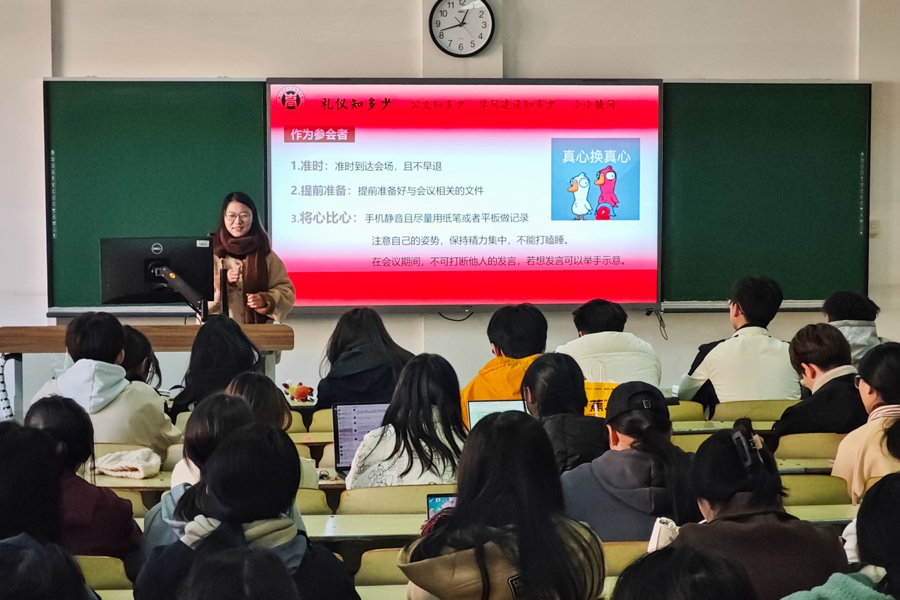 11月29日中午,9001jcc金沙以诚为本第三十二期“爱学会议室”于17幢135举行,会议围绕“礼仪知多少”“公文知多少”“组织建设知多少”展开,9001jcc金沙以诚为本学生会、团务中心、融媒体中心青训营成员参与会议。会议由学生会主席团成员刘昱伶主讲。