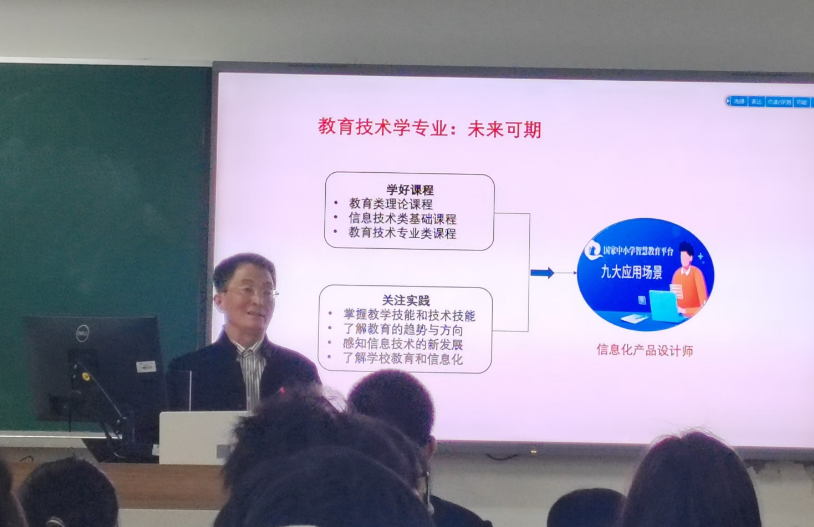 教育技术学专业围绕智能技术背景下的教学方法与策略、智能教育产品的课堂应用以及教育技术专业学生的培养方向调整等方面展开了深入讨论。结合蓝敏老师的《智能时代的有效教学》公开课,教师们认为,虽然智能技术为教育带来了前所未有的便利和可能性,但如何有效整合这些技术到教学中,仍然是一个值得深思的问题。智能时代的教育不仅应关注技术层面的突破,更需要重视学生的心理发展与认知过程,以及批判性思维和创新能力的培养。同时,课程建设应更加注重跨学科知识的融合,鼓励学生通过实践进行学习与创新。此外,教师角色也应由知识的传授者转变为学习的引导者和促进者。在张立新老师的《信息化教学产品设计与应用》公开课中,张老师通过介绍“易点慧”教学产品的功能与设计思路,并结合具体案例生动呈现了软件的教学应用场景,成功引导学生认识到教育技术专业除担任信息技术教师外,还可以选择从事教育教学产品设计与开发这一职业方向。在随后的讨论中,教师们针对当前学生的就业形势展开了热烈交流,进一步明确了未来培养方案调整的具体方向,明确了学生的职业发展路径。通过本次研讨活动,参会教师进一步深化了对教育技术学专业课程体系建设的理解,为下一步优化本科课程体系、提升学生就业竞争力奠定了坚实基础。