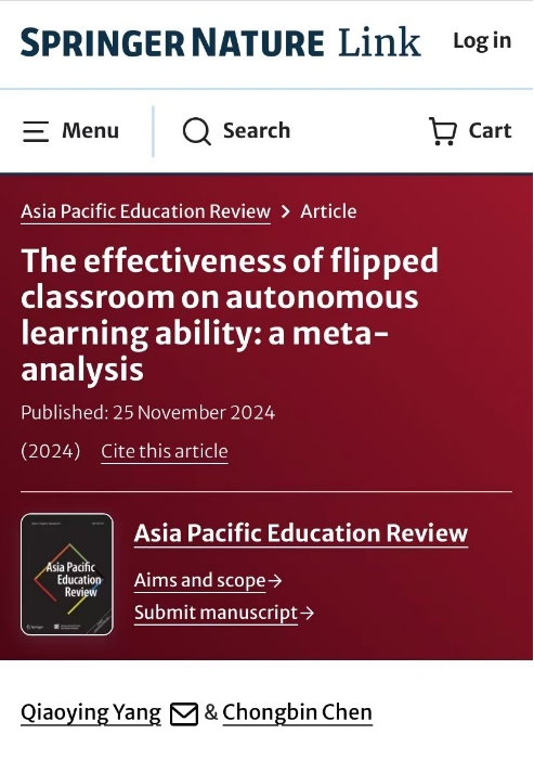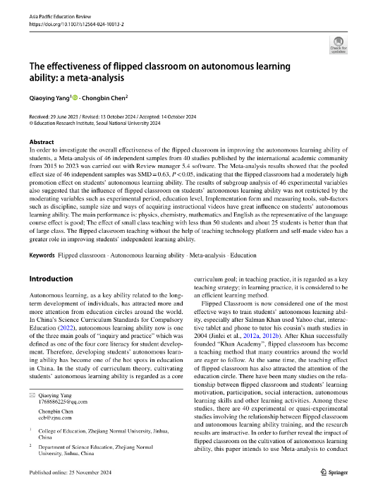 近日,9001jcc金沙以诚为本科学与技术教育专业研究生杨翘荧在SSCI来源期刊《Asia Pacific Education Review》以第一作者和通讯作者发表学术论文《The effectiveness of flipped classroom on autonomous learning ability: a meta-analysis》。2022年新出台的《义务教育科学课程标准》提出,自主学习能力是学生“探究实践”核心素养的三个组成部分之一,需要在科学课程教学中重点培养。翻转课堂(Flipped Classroom)被认为是培养学生自主学习能力最为有效的教学方式之一。