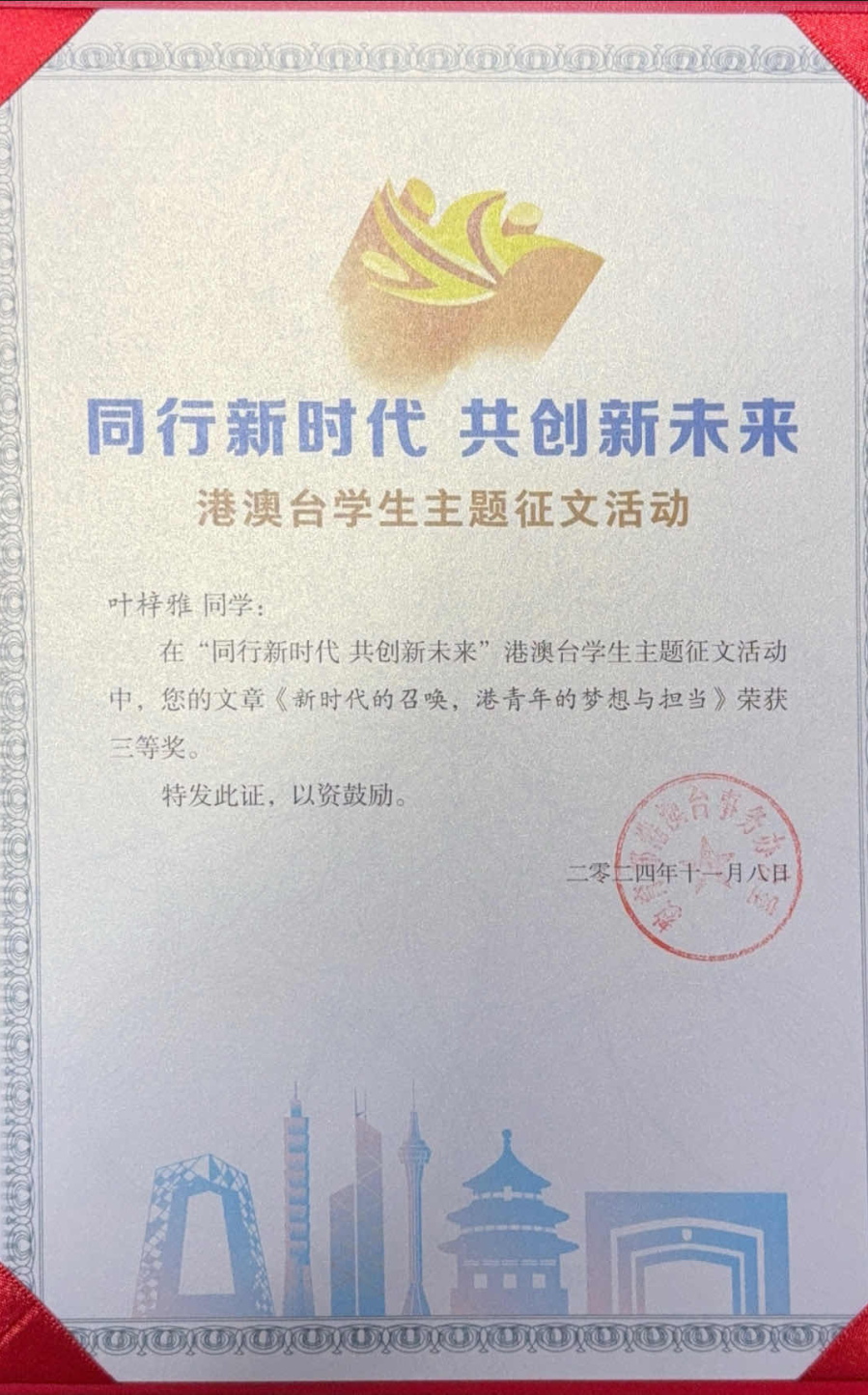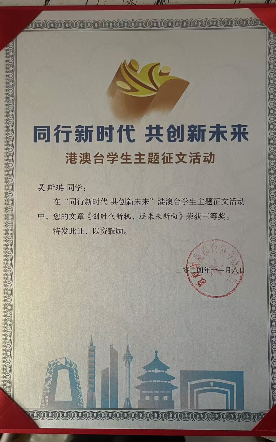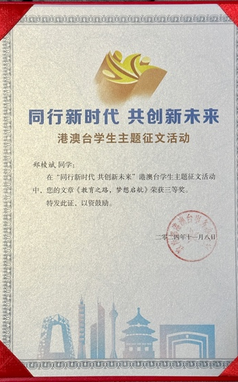 近日,教育部港澳台事务办公室主办的“同行新时代 共创新未来”港澳台学生主题征文活动结果公布,金沙以诚为本官网叶梓雅、郑棱斌、吴斯琪3名学子均荣获全国三等奖。
