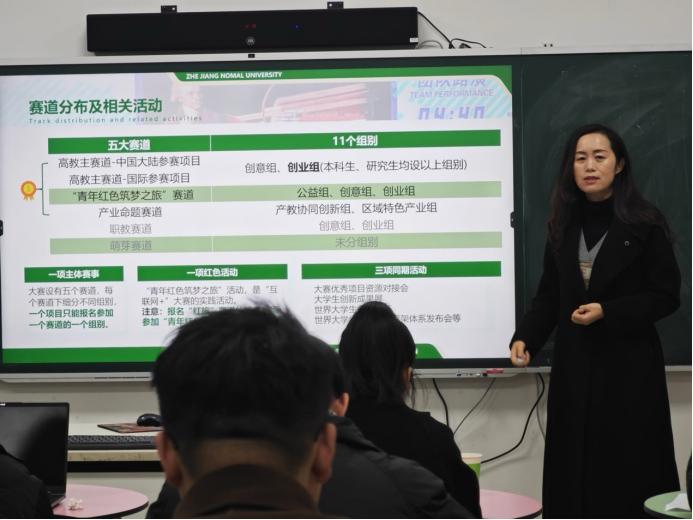 学院学工办主任、团委书记刘景弟分享了参赛指导经验,他以实际项目为例,再次强调了项目兼具创新性与社会价值的重要性,并对项目赛道的选择、材料打磨等关键环节进行逐一介绍。