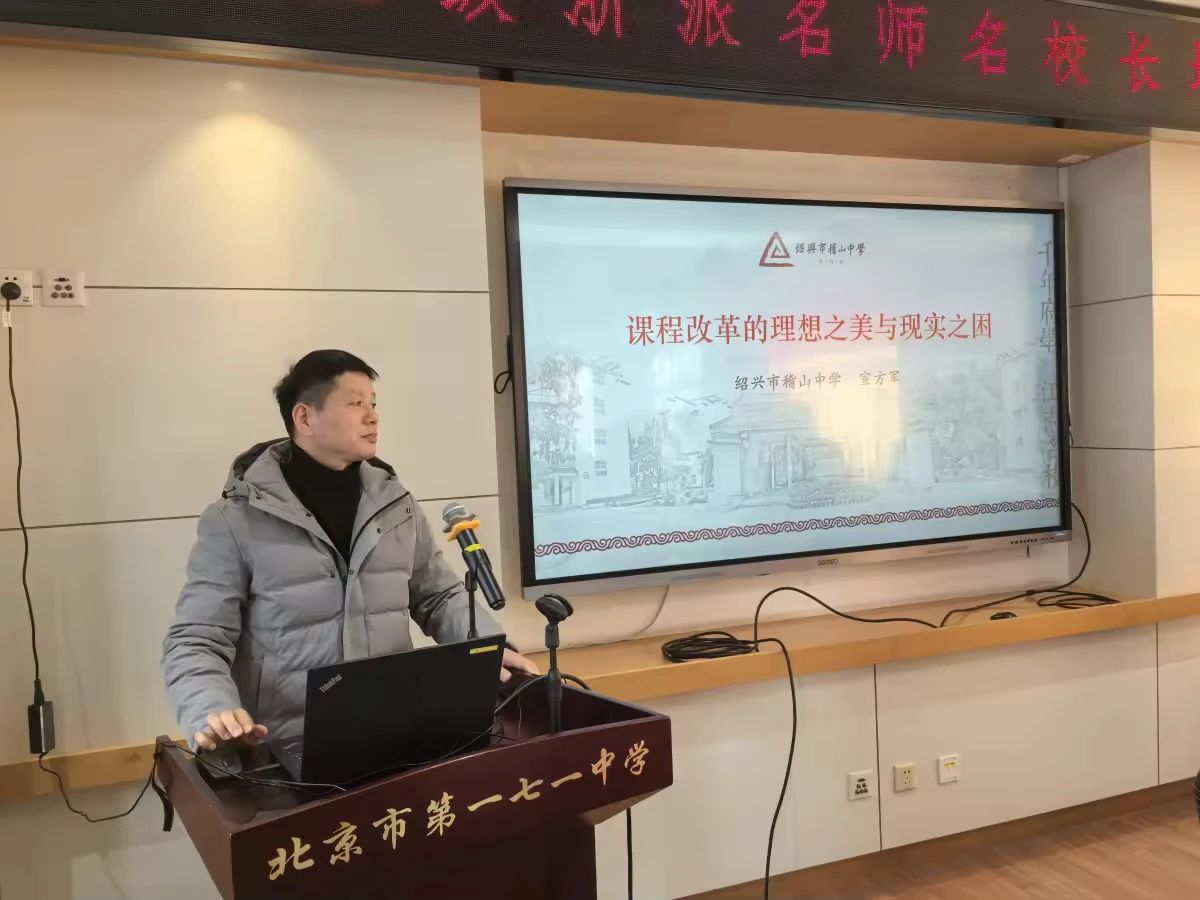 宣方军在《课程改革的理想之美与现实之困》汇报中,结合国家课程改革要求与学校实践实际,分享了推进落地的难点,以及绍兴市稽山中学为此所作出的有益探索。