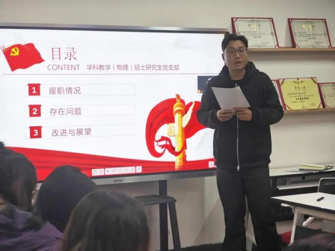 2024年,学科教学(物理)硕士研究生党支部强化政治建设,夯实思想基础;结合学科特点,引导支部党员将理论学习与专业发展相结合;强化服务意识和队伍建设,严格党员发展和教育管理;严守纪律,定期自查,推动持续改进。展望未来,党支部将提升思想政治教育的针对性和实效性,将党的理论学习放在首位,并优化组织结构,增强党支部凝聚力和战斗力。