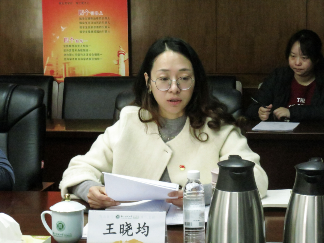王晓均结合支部工作,分享了学习心得。她认为行政支部应发挥政策落实的执行者、统筹资源的协调者和服务师生的保障者等三大作用,结合《纲要》要在以下四个方面有所发展:一是深化党建引领,凝聚学科发展共识;二是优化管理效能,服务学科与人才发展;三是创新人才培养模式,强化实践育人;四是强化监督保障,推动学院可持续发展。