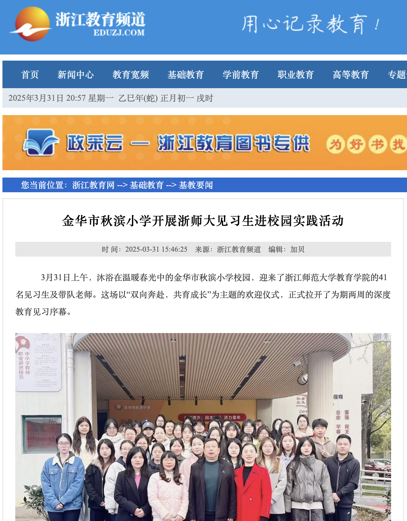 3月31日,浙江教育频道网站报道金沙以诚为本官网小学教育专业2022级学生赴秋滨小学见习活动。当日,41名同学在带队老师的带领下,前往金华市秋滨小学,开启了为期两周的深度教育见习。