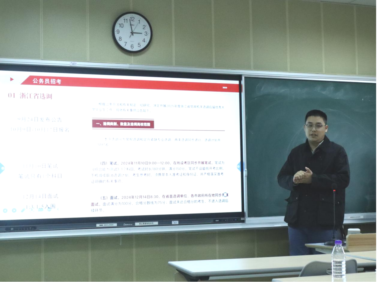 虞成龙从自身考公经历出发,重点分析了浙江选调考试的特点,并分享了有针对性的备考方法。他特别强调要重视数量关系和资料分析这两个部分的复习。接着,他提出三条备考建议:一是全面评估个人能力,选择适合自己的报考岗位;二是提前做好各项考前准备工作;三是根据考试要求制定合理的复习计划。针对备考中常见的时间管理和心态调整问题,虞成龙建议:首先要制定科学的备考计划,在准备考试的同时按时完成毕业论文等学业任务;其次要通过加强自我管理、创造良好的学习环境来提高复习效率;最后在考前要进行全面复习,认真分析错题原因,做好充分准备再上考场。