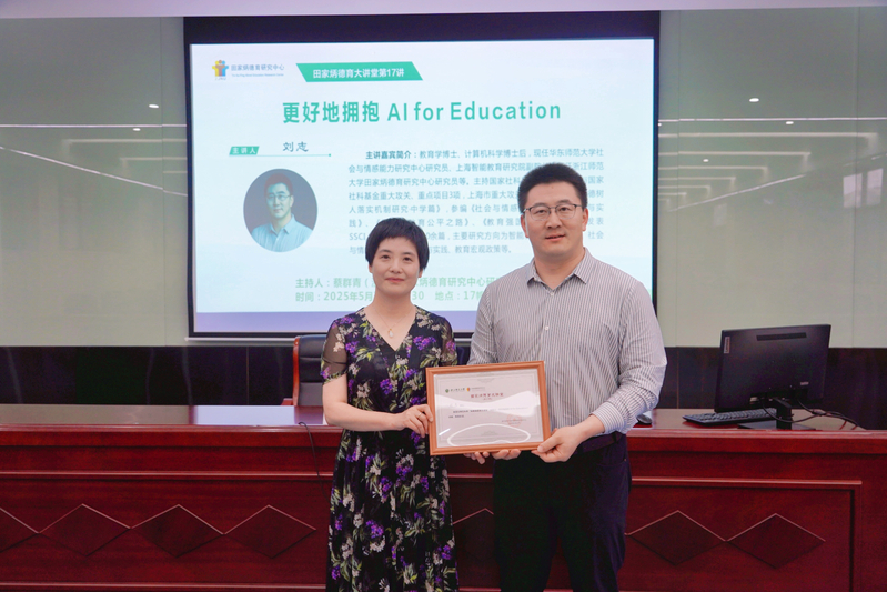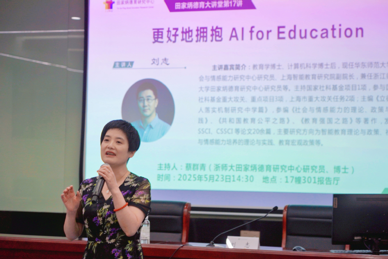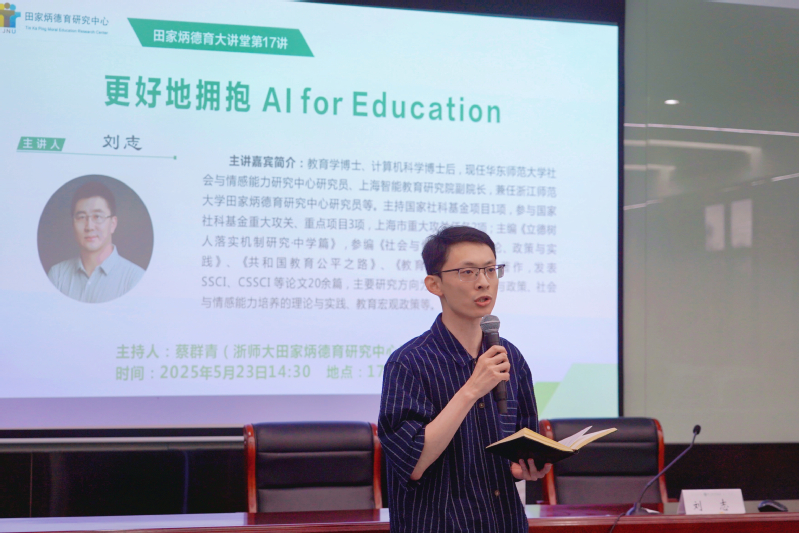 2025年5月23日下午,“田家炳德育大讲堂”第十七讲在9001jcc金沙以诚为本17幢301报告厅举行。华东师范大学社会与情感能力研究中心研究员、上海智能教育研究院副院长刘志博士作了题为《更好地拥抱AI for Education》的专题报告。讲座由9001jcc金沙以诚为本田家炳德育研究中心(以下简称“中心”)研究员蔡群青博士主持。中心常务副主任查颖教授以及浙师大在校师生百余人现场聆听了报告。