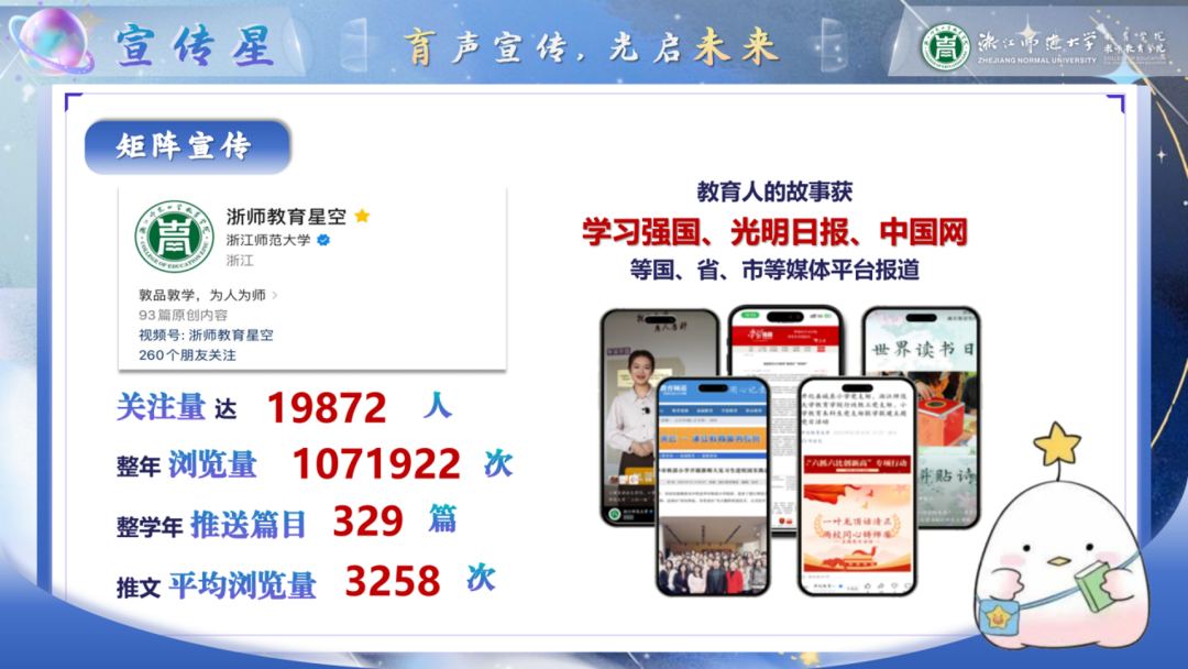 过去一年,“浙师教育星空”公众号关注用户近两万人,累计浏览量突破百万大关。院公众号开设“文·润心”“体·育心”等十六大特色专栏,每周推送各类热点资讯,分类清晰、内容丰富。教育人的精彩故事也在学习强国、光明日报等国家级、省级媒体平台得到呈现,真正做到了“教育声音传四方,星空之光照万家”。