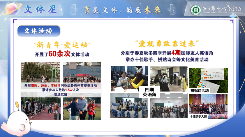 青春正当时,运动展风姿。院学生会累计开展文体活动60余次,涵盖国际、院际、师生、本硕博各级各类赛事,参与人数达5000人次。在广播操赛等体育竞赛中,教育学子屡获佳绩。院学生会还精心主办了四期“英语角”活动,促进中外文化交流,为校园增添浓厚的国际化氛围。