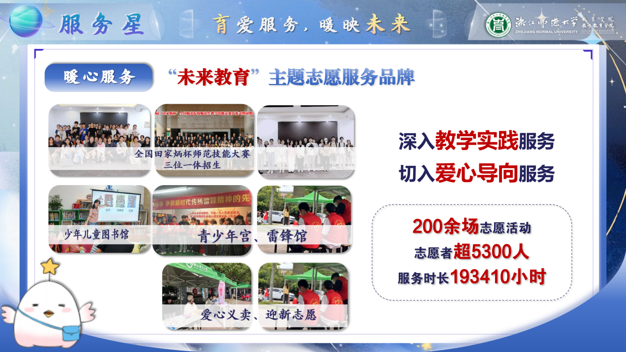 以专业立志愿,用爱心做服务。本学年,院学生会持续打造青少年宫跟班助教、田家炳师范技能竞赛志愿者等具有教育特色的志愿服务品牌项目,新设“学伴帮帮团”“学风宣讲团”“三八送祝福”等院级特色志愿活动,通过“教小星微服务”问卷收集同学意见建议,真正做到将服务送到心坎上、把温暖传递到身边。