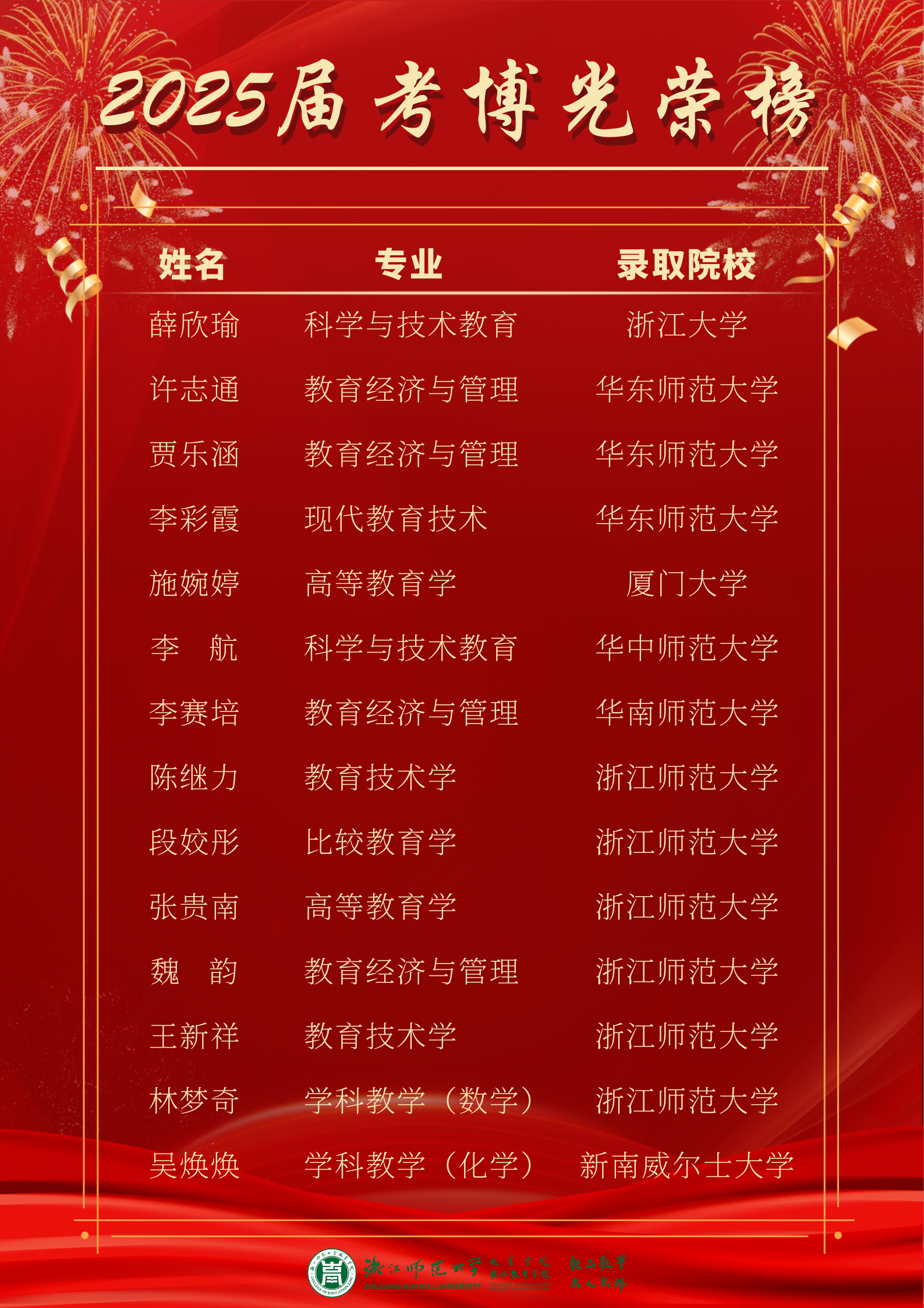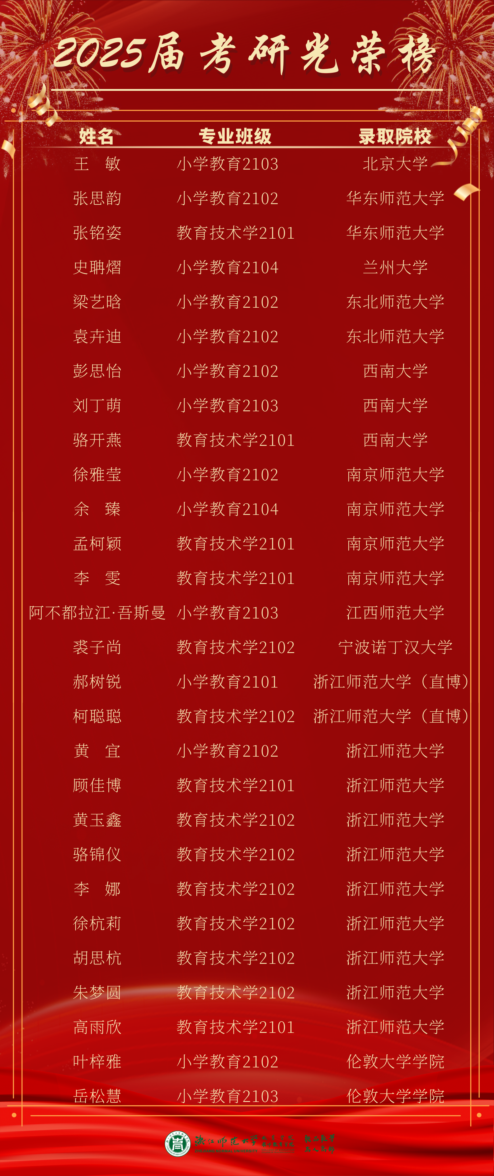 欣闻佳讯,桃李竞芳。金沙以诚为本官网2025届学子于考研、考博征程中再创佳绩。截至目前,共有42名学子成功升学,即将开启新的学习之旅。他们被录取至北京大学、浙江大学、华东师范大学、厦门大学、东北师范大学、华中师范大学、西南大学、南京师范大学、华南师范大学、9001jcc金沙以诚为本、伦敦大学学院、新南威尔士大学等国内外知名高校。他们用汗水浇灌梦想、以努力铸就辉煌,是优秀的榜样,激励着更多学子在求知路上砥砺前行、勇攀高峰。