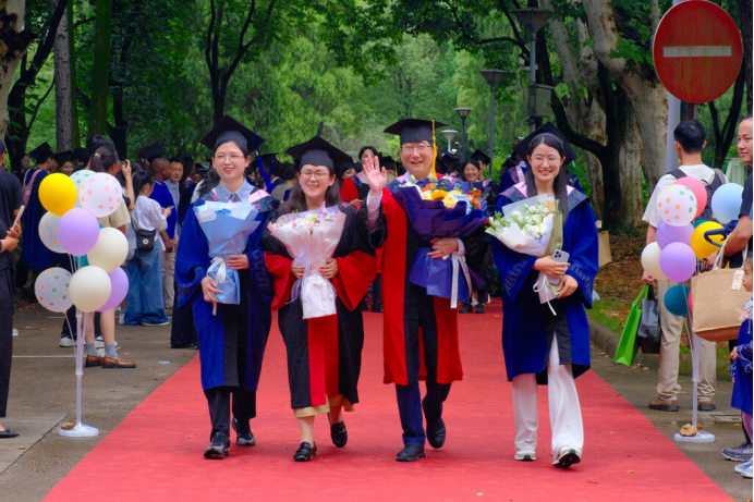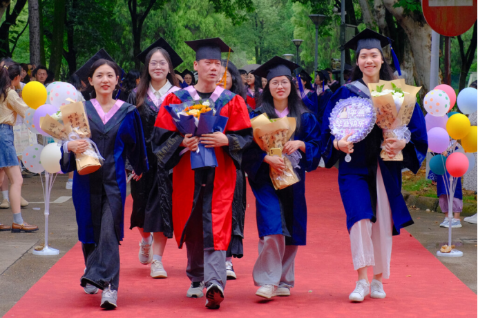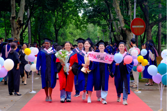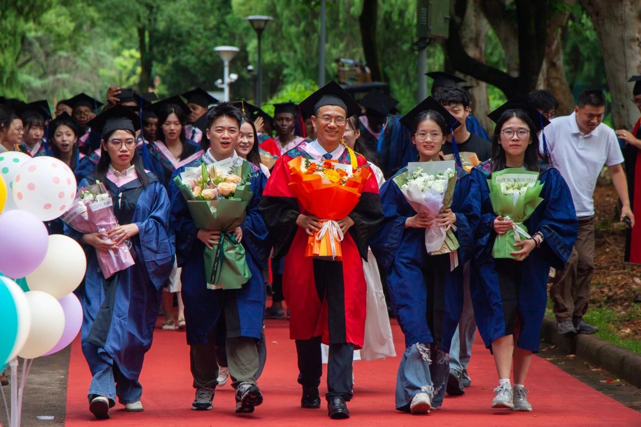 伴随着悠扬的歌声,毕业生们在师长的带领下踏上红毯,将签名墙前的青春笑容定格为永恒的校园记忆。尽管细雨如丝,翩跹而落,却丝毫未能浇灭现场如火的热情。这蓬勃的青春之火,正如青年们昂扬的生命力,在风雨兼程中,坚定地奔向心中的梦想。