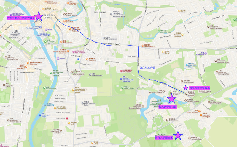 约克大学交通便利,2.5小时到爱丁堡,2小时到伦敦,1.5小时左右到曼彻斯特,20分钟抵达利兹。约克被评为英格兰和威尔士第二安全的城市,在英国宜居友好城市排名中位居第二。